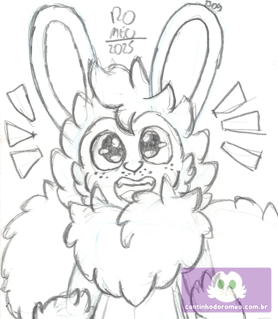 Estou bem empolgado com as mudanças que acabei fazendo no Romeo, e com isso pensei em uma coisa: Como o Romeo ficaria com uma expressão de surpreso? Imaginei ele com as orelhas estendidas, quando ele estivesse surpreso, e foi isso que decidi colocar nesse desenho.