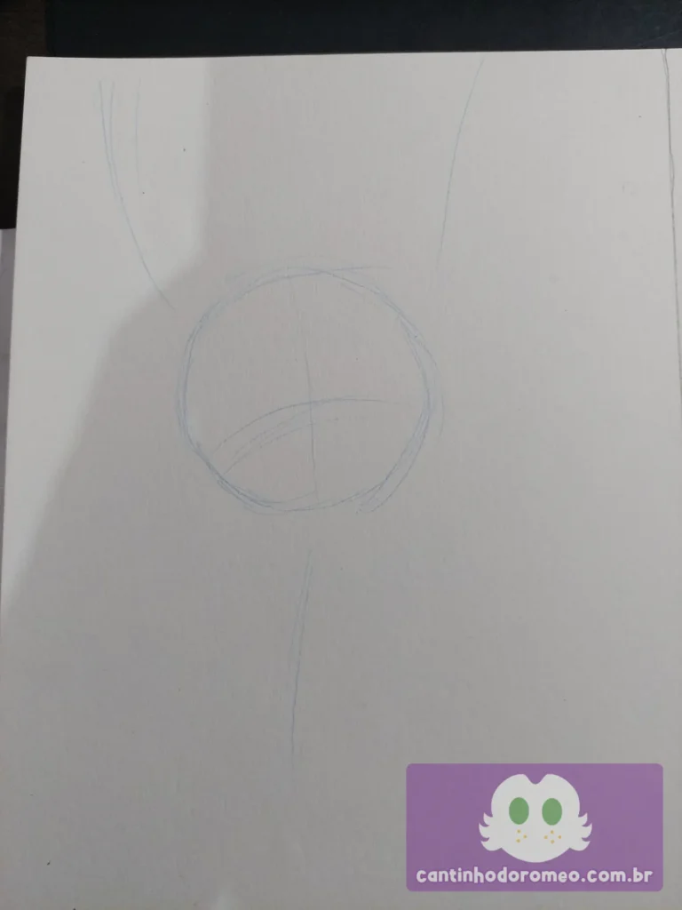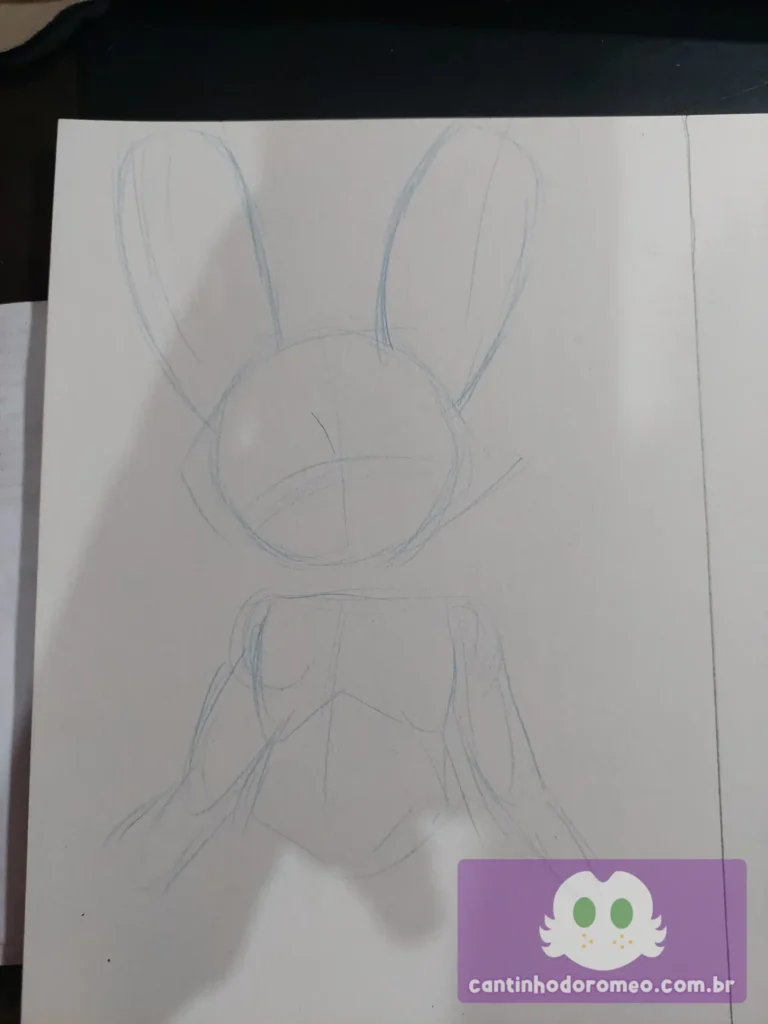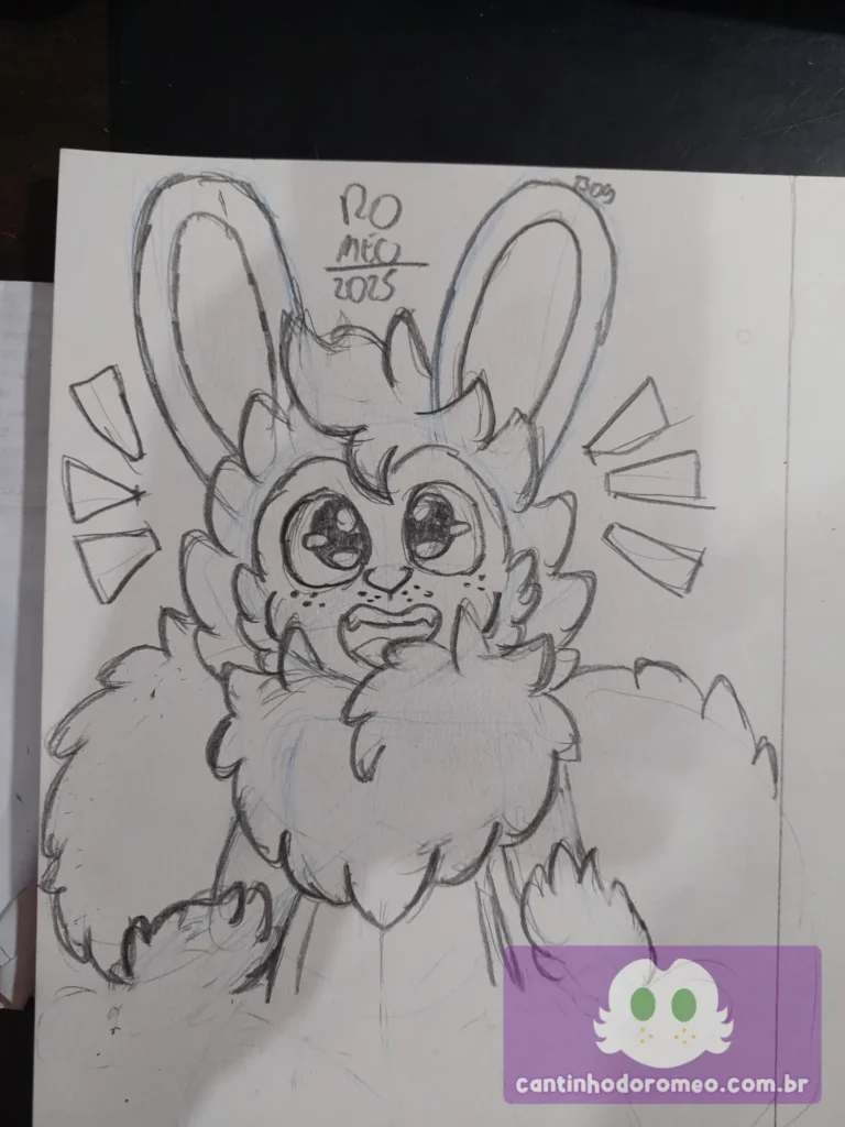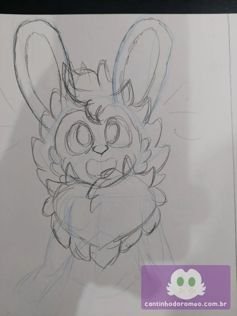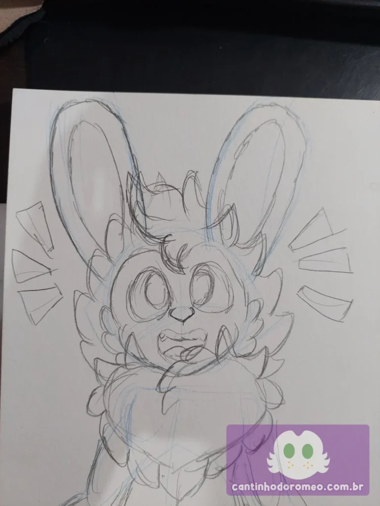 Comecei o desenho como sempre: Com as primeiras linhas do desenho. Depois disso, fui para o esboço, que ficou muito simples: Apenas o Romeo olhando de frente, com as orelhas estendidas, e os braços para os lados. Como se ele estivesse surpreso. E eu gostei desse esboço.