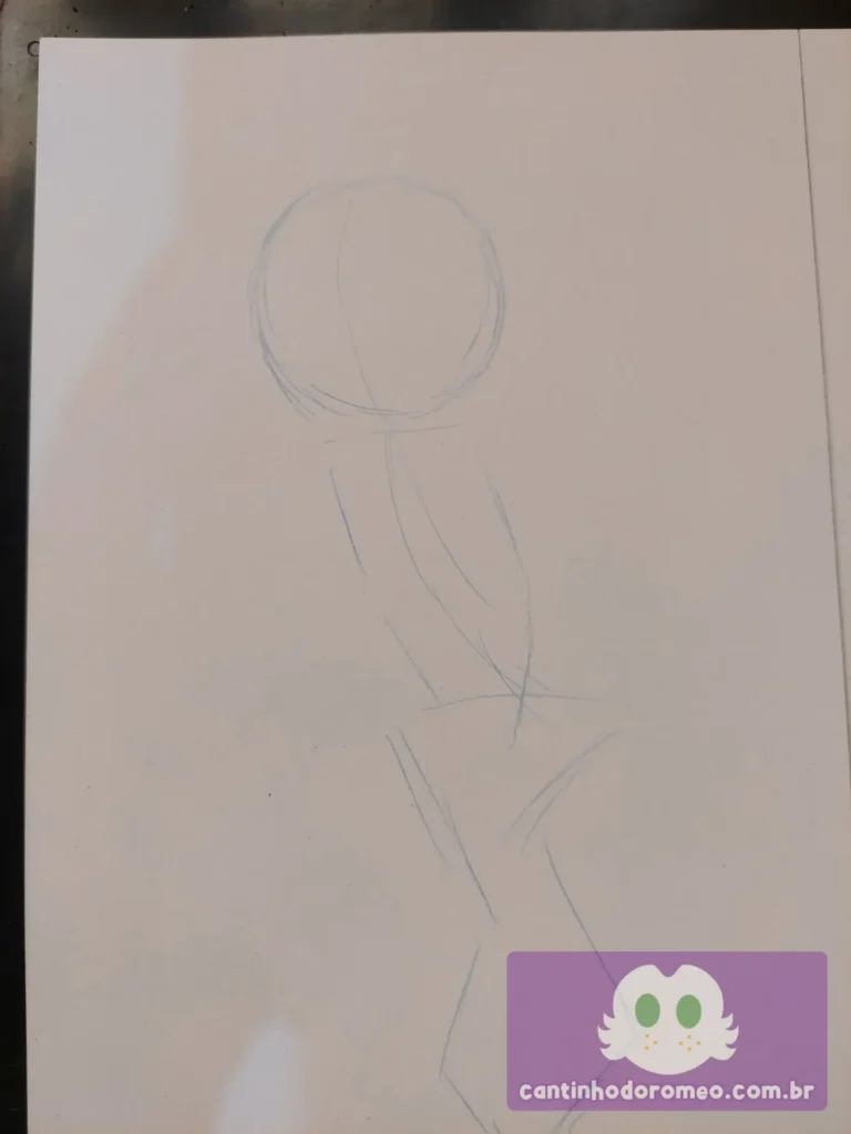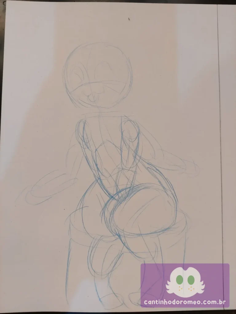 Assim, prossegui para o esboço, onde fiz a cabeça, tronco, braços, coxas e patas. Além do local onde o Romeo estaria sentado.