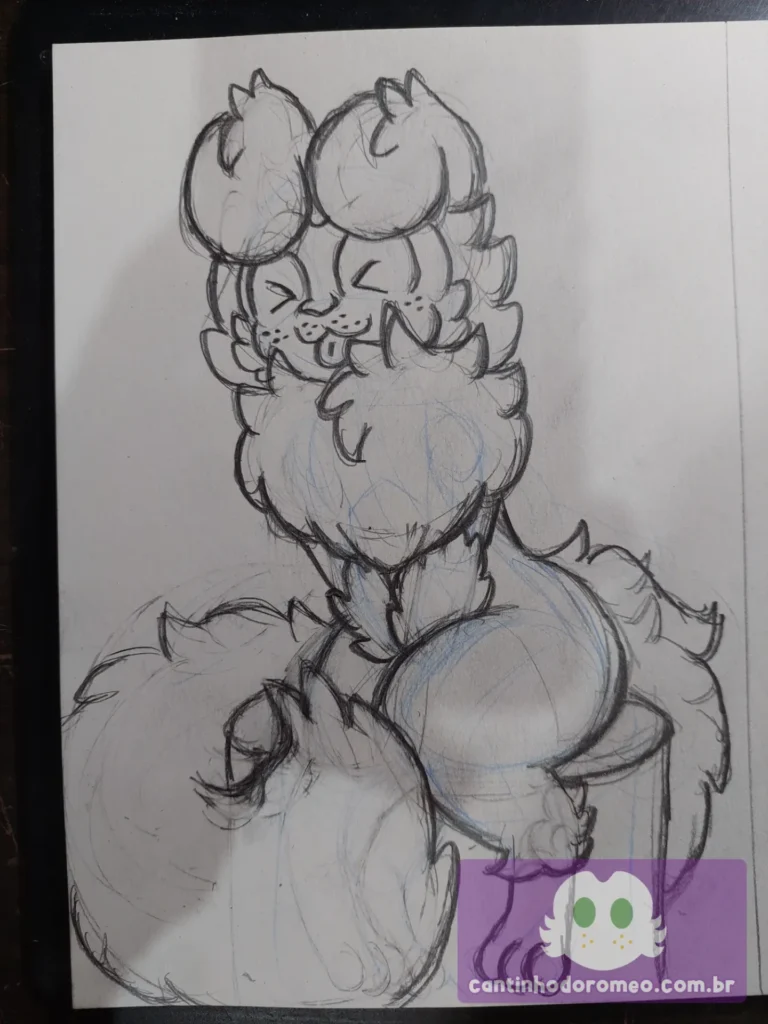 Depois avancei mais no esboço. Fiz as orelhas, rosto, pelos das bochechas e o colar de pelos. Quanto as patas, primeiro fiz o Romeo com as patas entre as coxas, depois mudei um pouco de ideia, e por fim voltei para a ideia inicial.