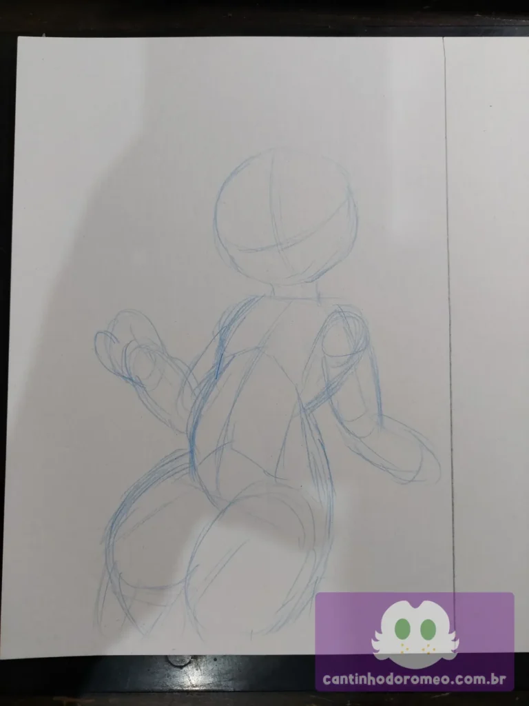 Comecei o desenho como sempre, com as primeiras linhas da pose. Com isso, fui para o esboço, onde eu fiz mais próximo à pose da inspiração, e gostei muito de como ficou.