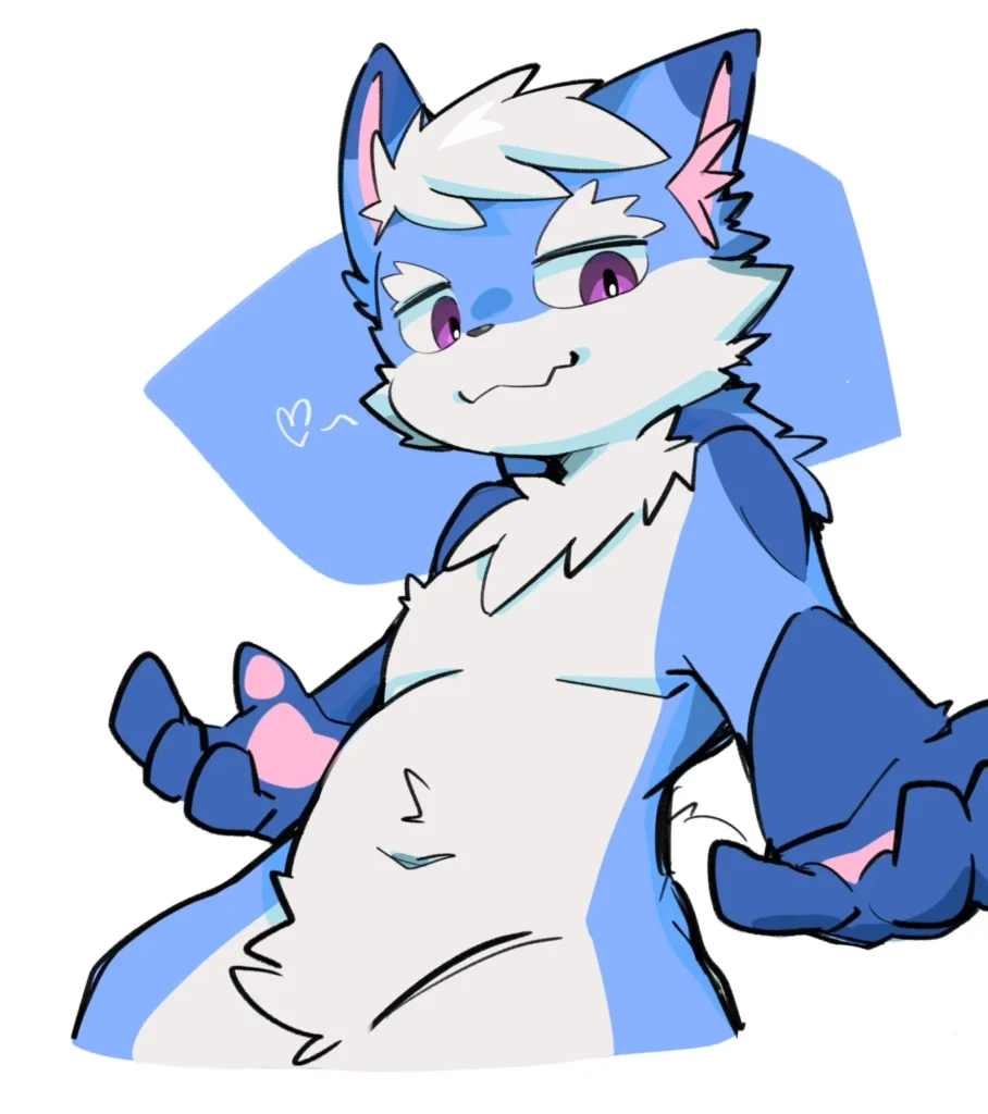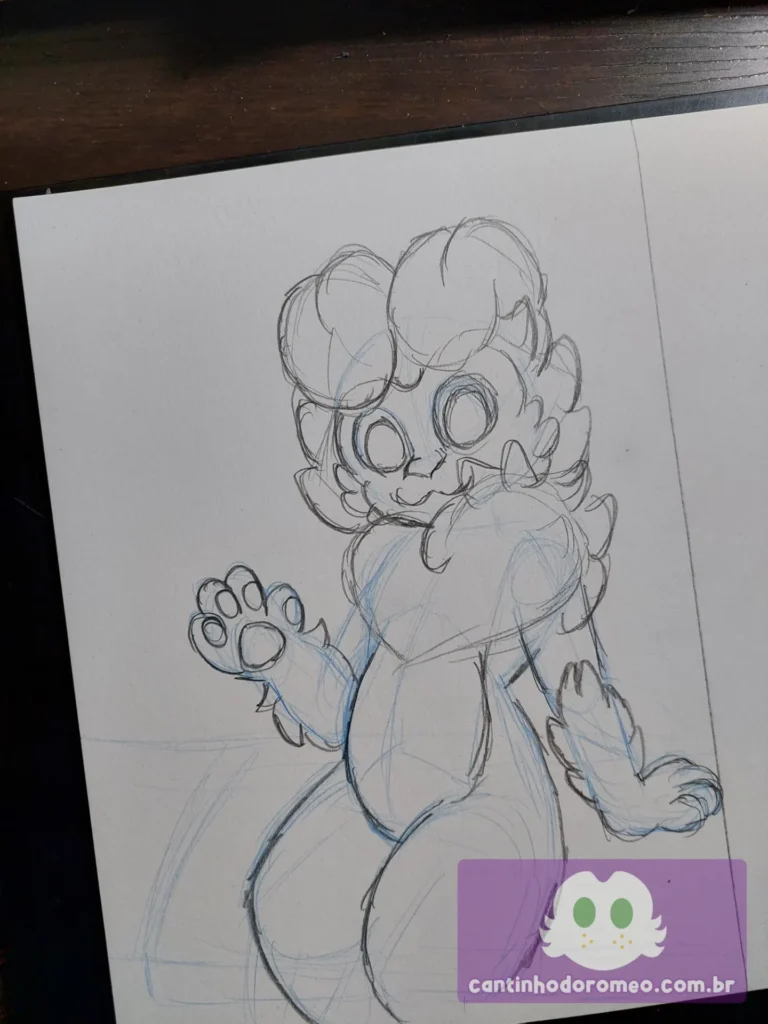 Eu poderia fazer qualquer um de meus personagens, mas acabei escolhendo o Romeo, que eu ando desenhando bastante e que estou gostando muito de como ele está ficando. Com isso, fiz as orelhas, olhos, patas, pelos da cabeça, bochechas e patas, colar de pelos e as coxas.