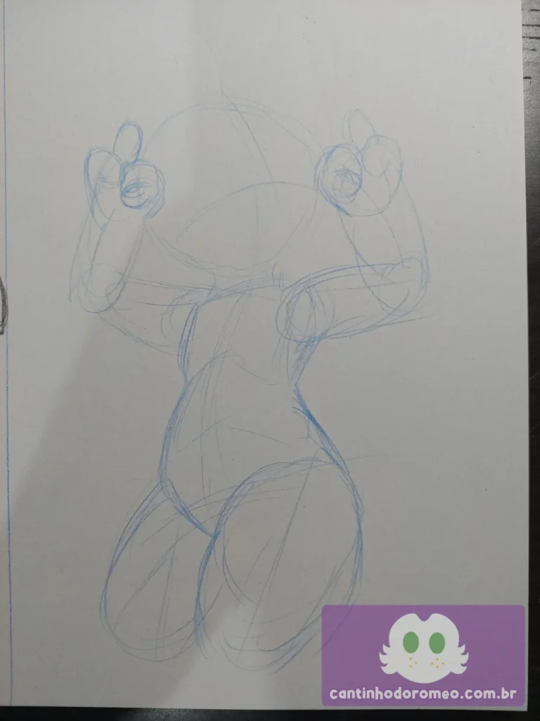 Comecei o desenho como sempre, com as primeiras linhas da pose, e até que gostei de como ficou. Com isso, fiz o esboço da pose, fazendo as coxas, tronco, braços e patas. E aqui, eu gostei mais ainda dessa pose.