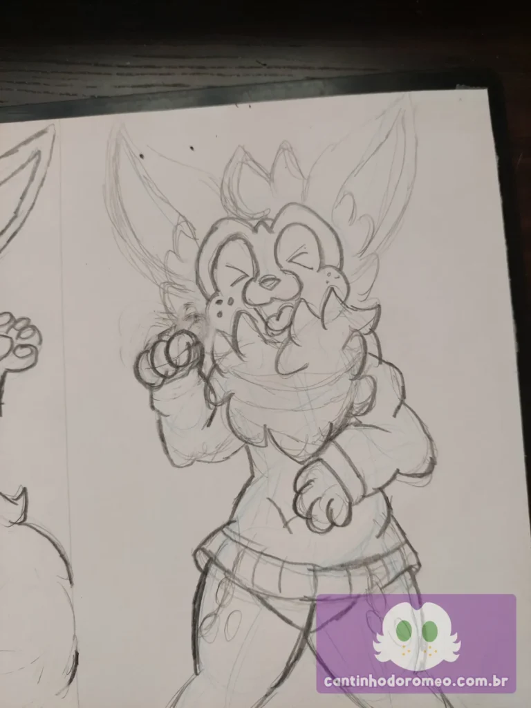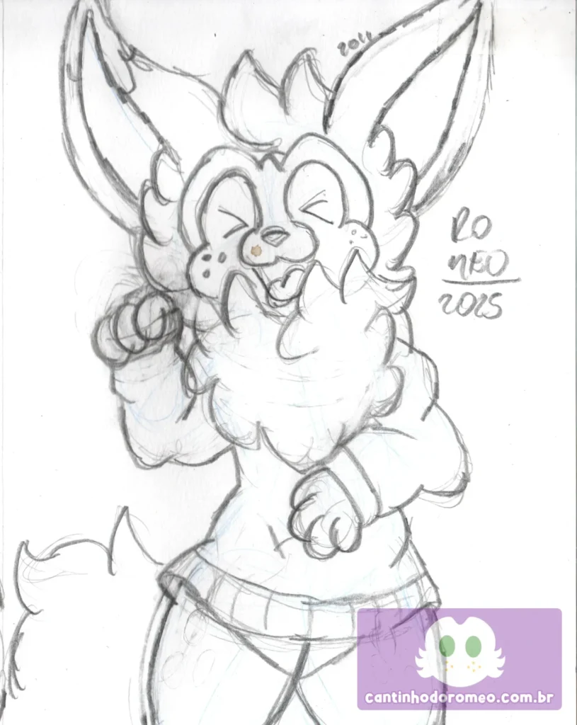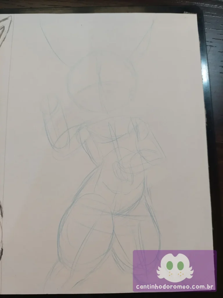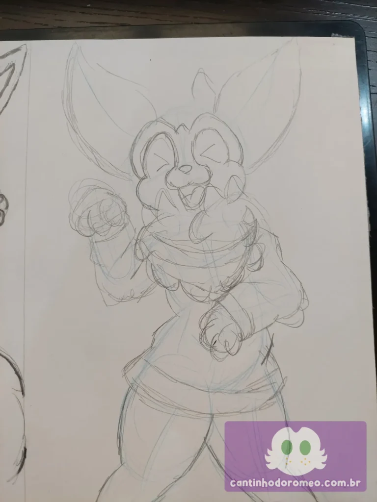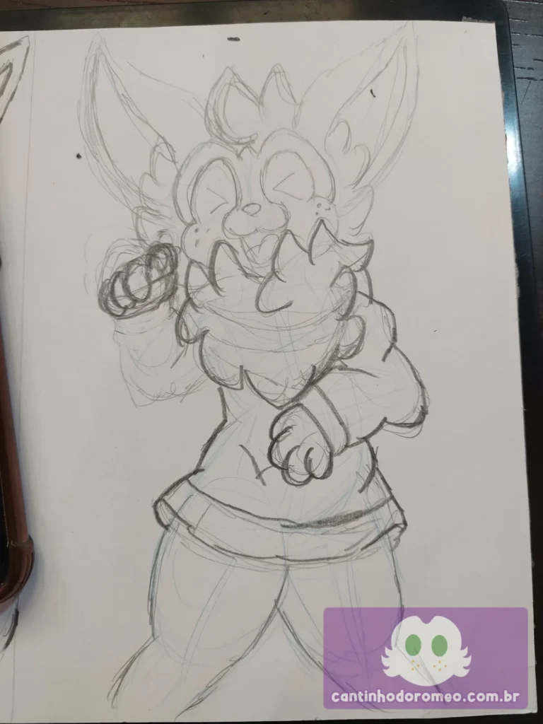 E com isso, avancei no desenho, onde melhorei as patas e comecei a reforçar os principais traços do desenho, e fiz a parte interna das orelhas, a franja e os pelos da cabeça do meu Eevee.