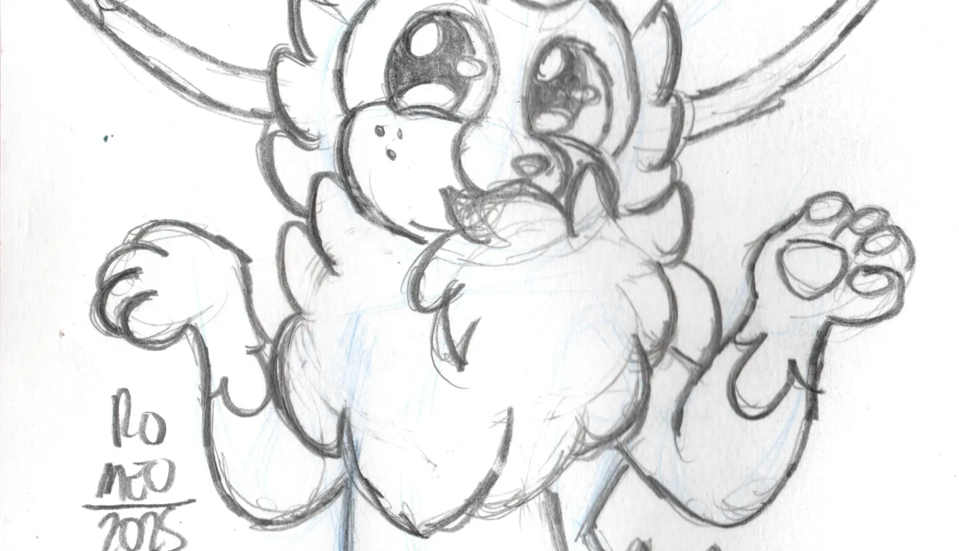 Depois, fiz os olhos, focinho, colar de pelos, orelhas e as marcas do rosto dele. Eu já estava gostando de como esse desenho estava ficando. Com isso, detalhei os olhos, deixei o colar de pelos mais peludinho e fiz as patas, franja, parte interna das orelhas e o esboço da cauda dele.