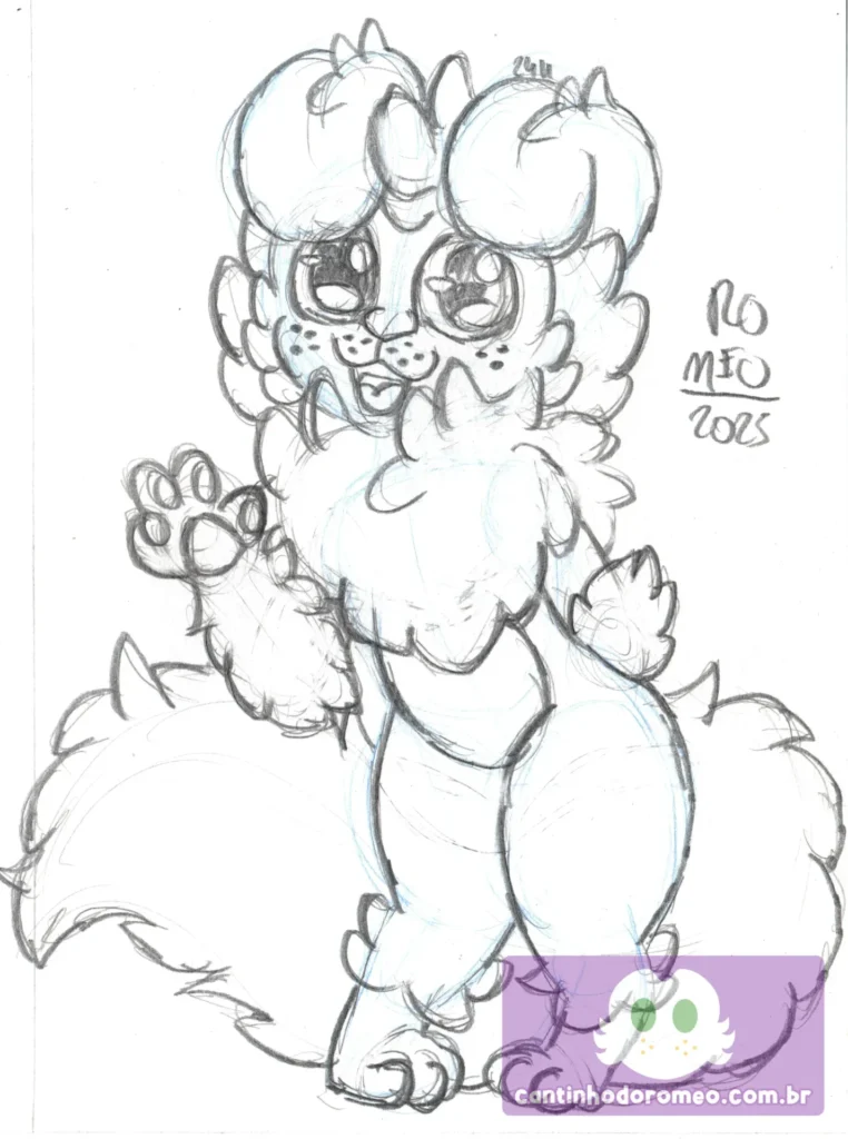Porém, decidi mudar algumas coisas. Sendo assim, eu mudei a posição de uma das patas, fazendo o Romeo como se ele estivesse acenando e tirei as meias do Romeo, o que pra mim deixou o desenho melhor. E também fiz os pelos das patas.
