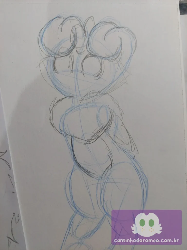 Comecei o desenho como sempre: Com as primeiras linhas da pose. E simplesmente adorei como essa pose havia ficado e assim, eu avancei no esboço, onde fiz as orelhas, olhos, colar de pelos, barriga, braços e coxas.