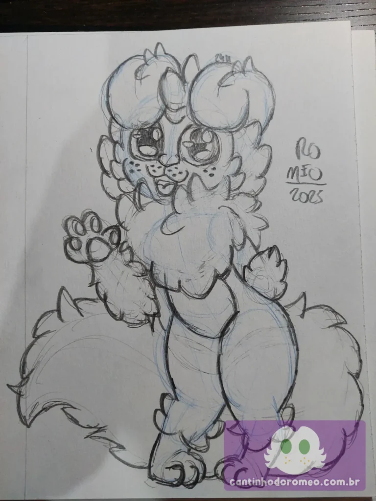 E o desenho já estava caminhando para a finalização. Assim, eu fiz a cauda do Romeo, o que gostei bastante de fazer. E amei essa cauda, por ela ter ficado bem longa. Por fim, apaguei os traços em excesso, reforcei os principais do desenho, pintei as pupilas dos olhos do Romeo e fiz as sardas dele.