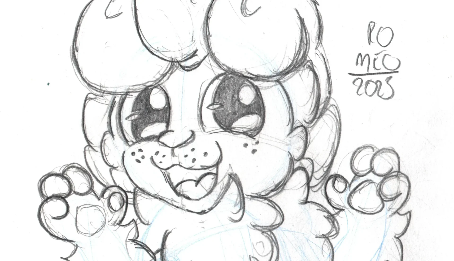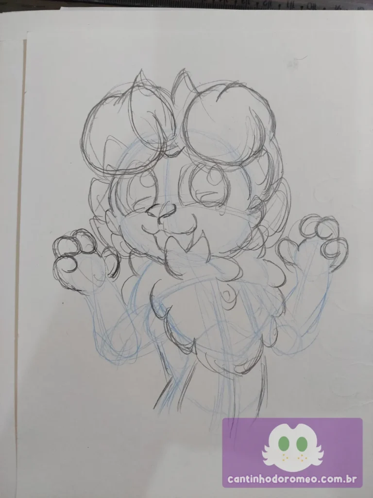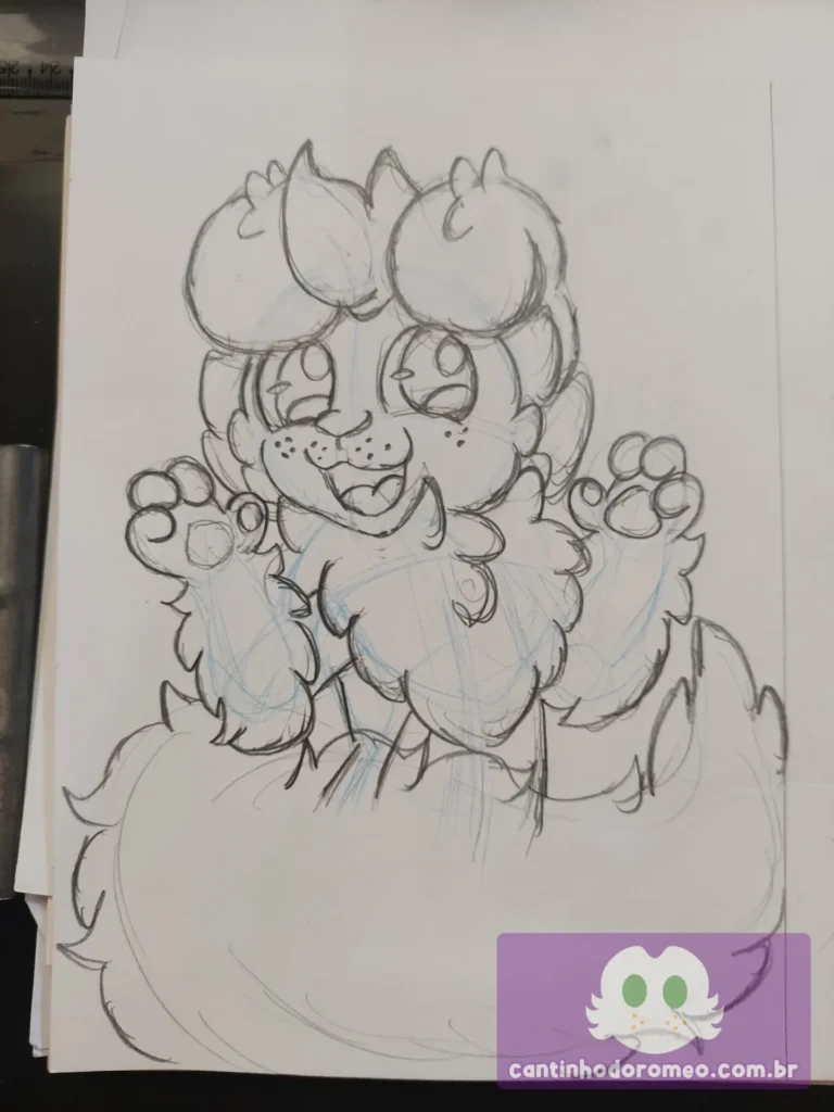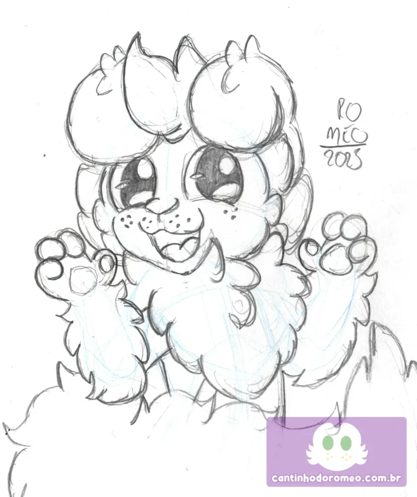 Com isso, avancei mais no desenho. Fiz as orelhas, franja, patas e os pelos das bochechas e da cabeça, além de deixar o colar de pelos mais peludinho e fazer o focinho, boca e detalhar os olhos. Depois fiz os pelos das patas e reforcei os traços do desenho.