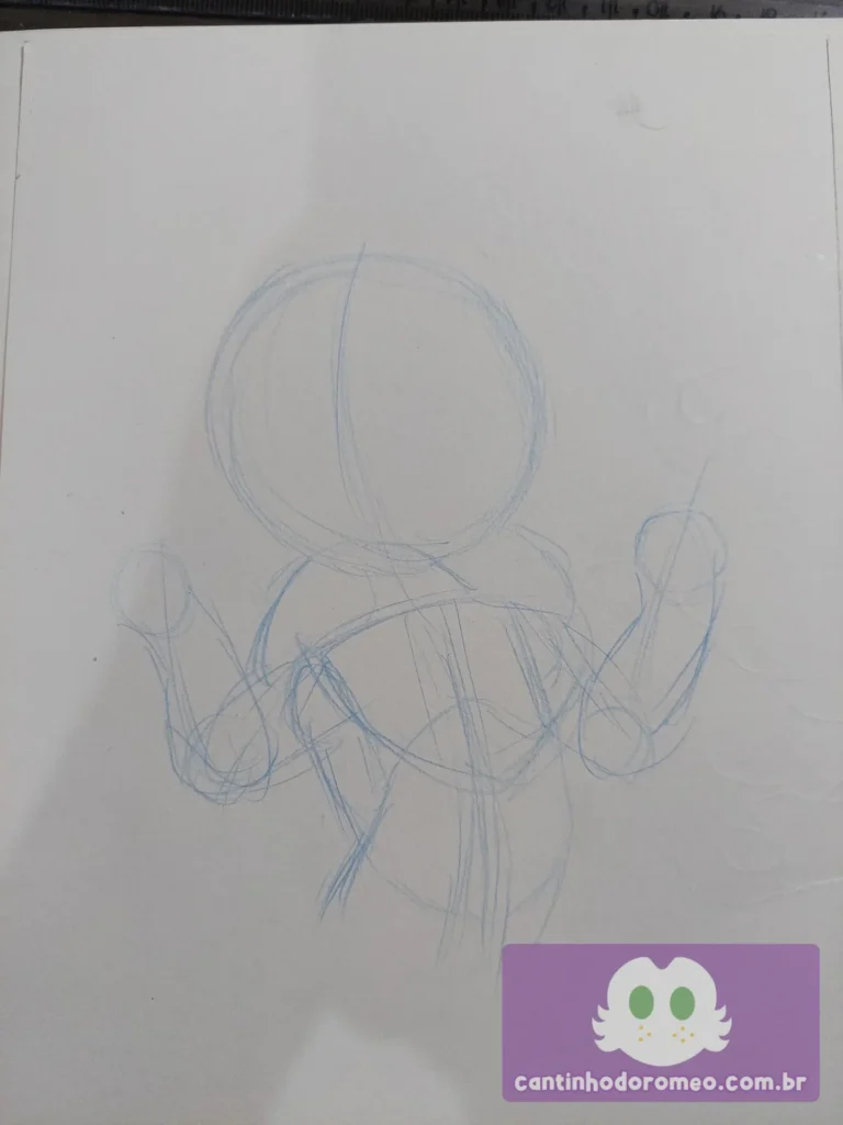 Comecei o desenho como sempre: Com as primeiras linhas da pose. E gostei de como ficou, então fui para o esboço do desenho, onde fiz o tronco, braços e o colar de pelos, e para mim o desenho estava ficando bem adorável.