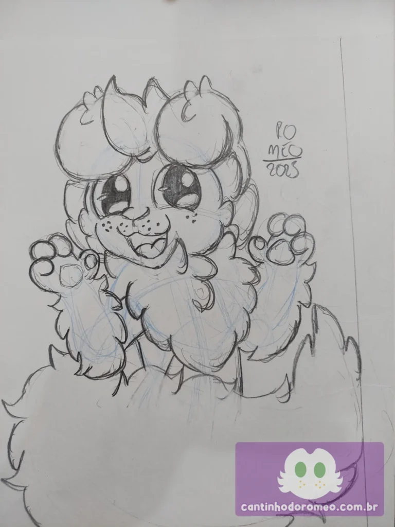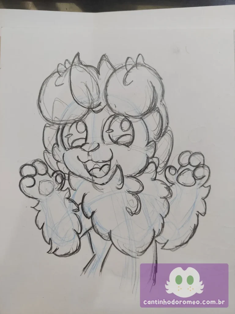 Mas faltava algo. Faltava a cauda do Romeo, e assim eu fiz e simplesmente amei como ela ficou no Romeo! Assim, eu fiz as sardas, pintei as pupilas dos olhos e apaguei os traços em excesso e assim, finalizei o desenho.