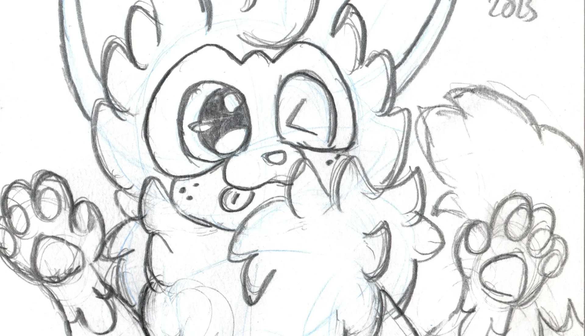 Eu estava adorando como o esboço estava, e assim decidi dar forma ao desenho. Fiz os pelos da cabeça, os dedos das patas, a marca das coxas, focinho e rosto. Depois fiz os olhos e orelhas e deixei o colar de pelos mais peludinho.