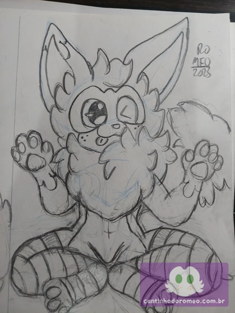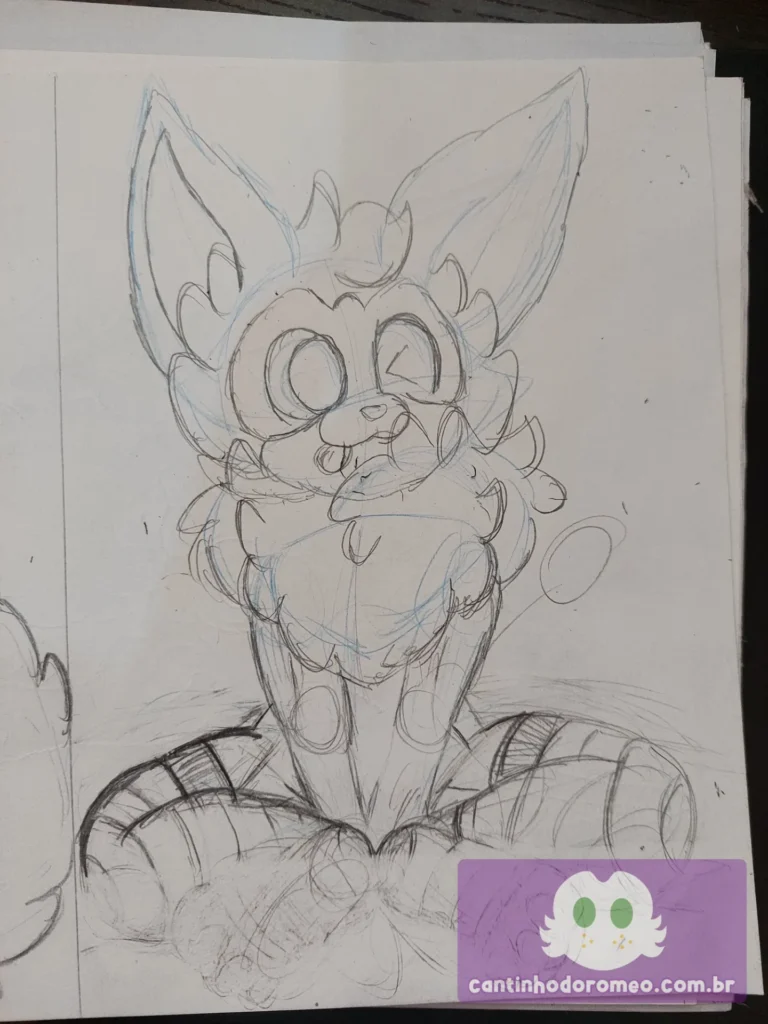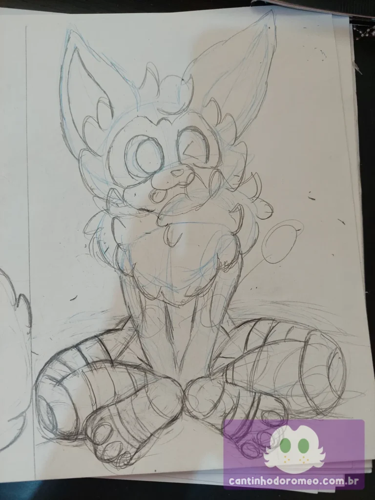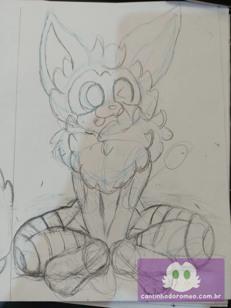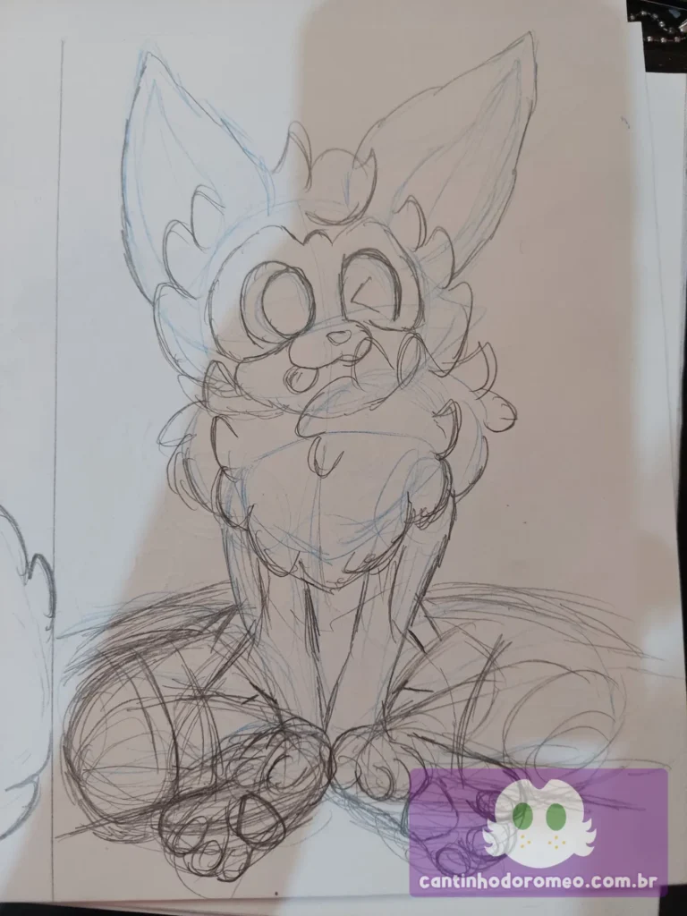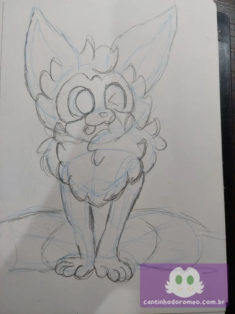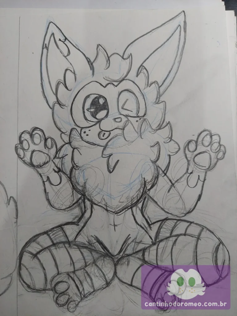 Comecei o desenho como sempre: Com as primeiras linhas da pose. Depois fui para o esboço, onde decidi por fazer o Cannella. Sendo assim fiz o esboço dos olhos, orelhas, braços, coxas, tronco e o colar de pelos.