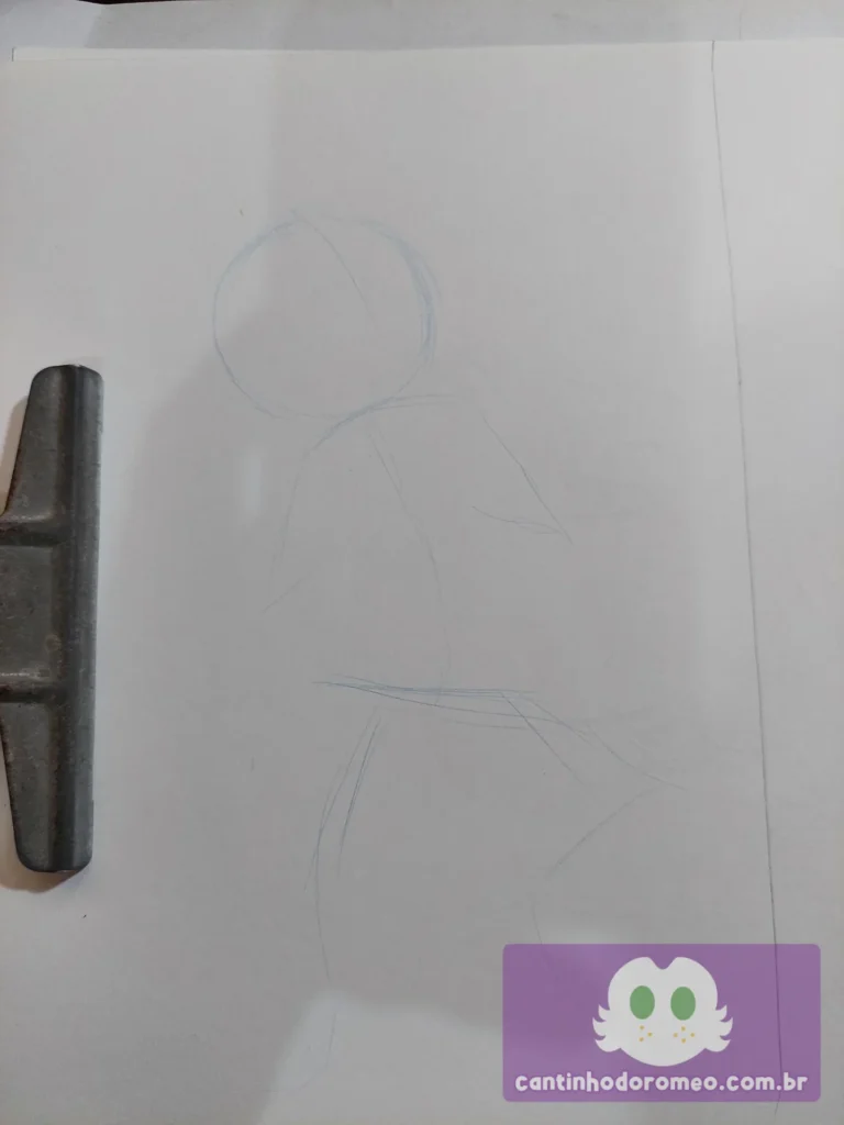 E por fim, para terminar o esboço, fiz as orelhas, a franja e os pelos da cabeça. Simplesmente adorei isso. Mas para finalizar o desenho, apaguei os traços em excesso e reforcei os demais.