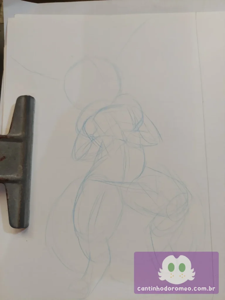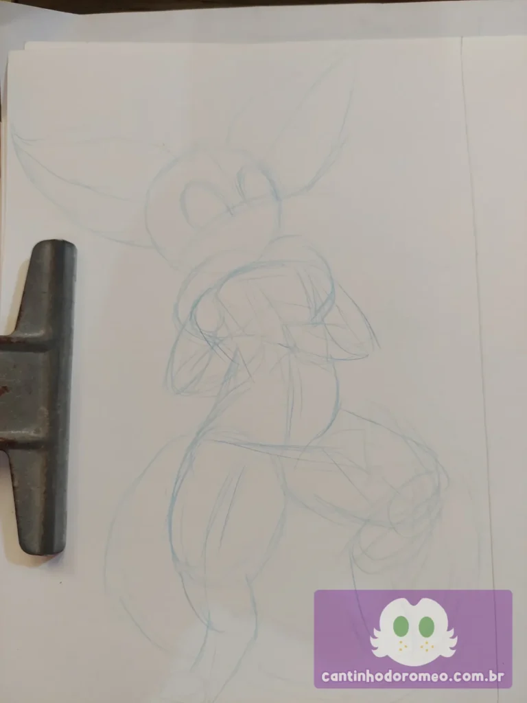 Comecei o desenho como sempre: Com as primeiras linhas da pose. Decidi fazer uma pose mais bobinha, com o Cannela levantando uma das pernas e com os braços na frente do corpo.