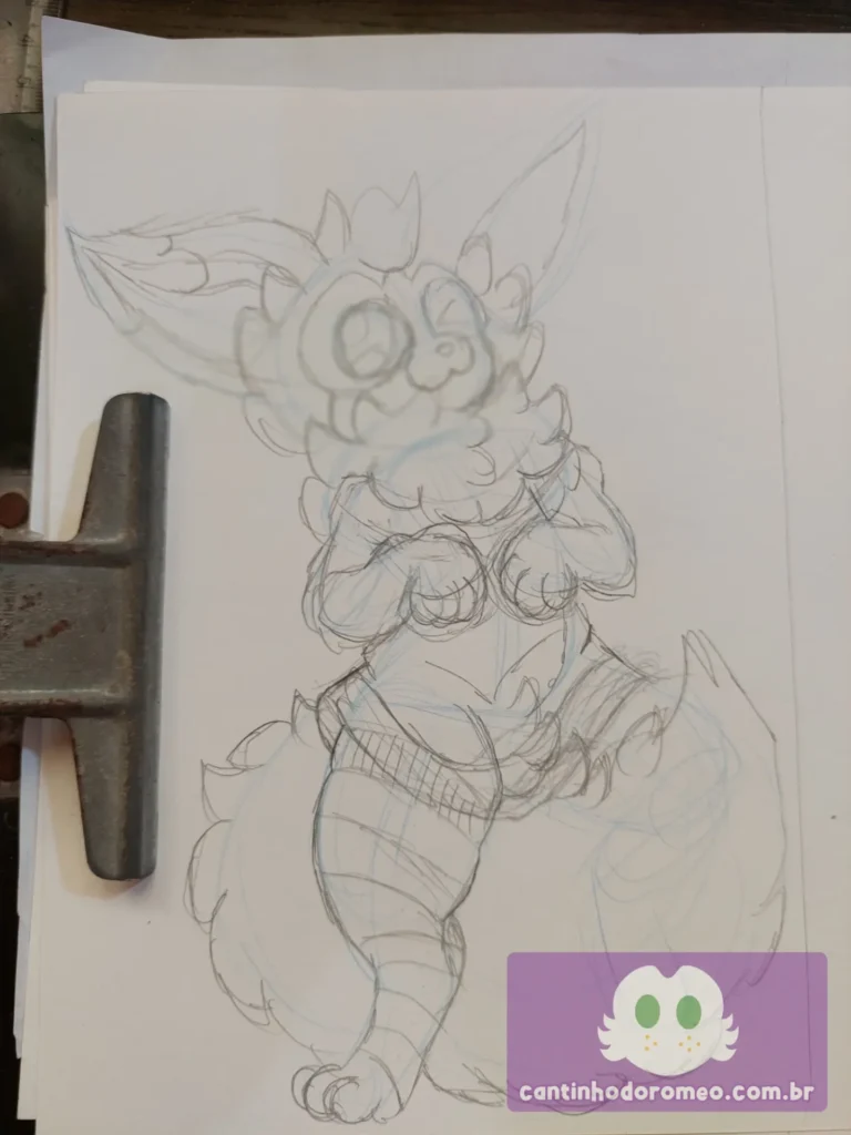 Com isso, fui para o esboço, onde fiz as orelhas, barriga, tronco, coxas, braços, patas, cauda e o colar de pelos. Para a cauda, decidi fazer ela passando por meio das pernas dele, e posso dizer que adorei essa ideia.