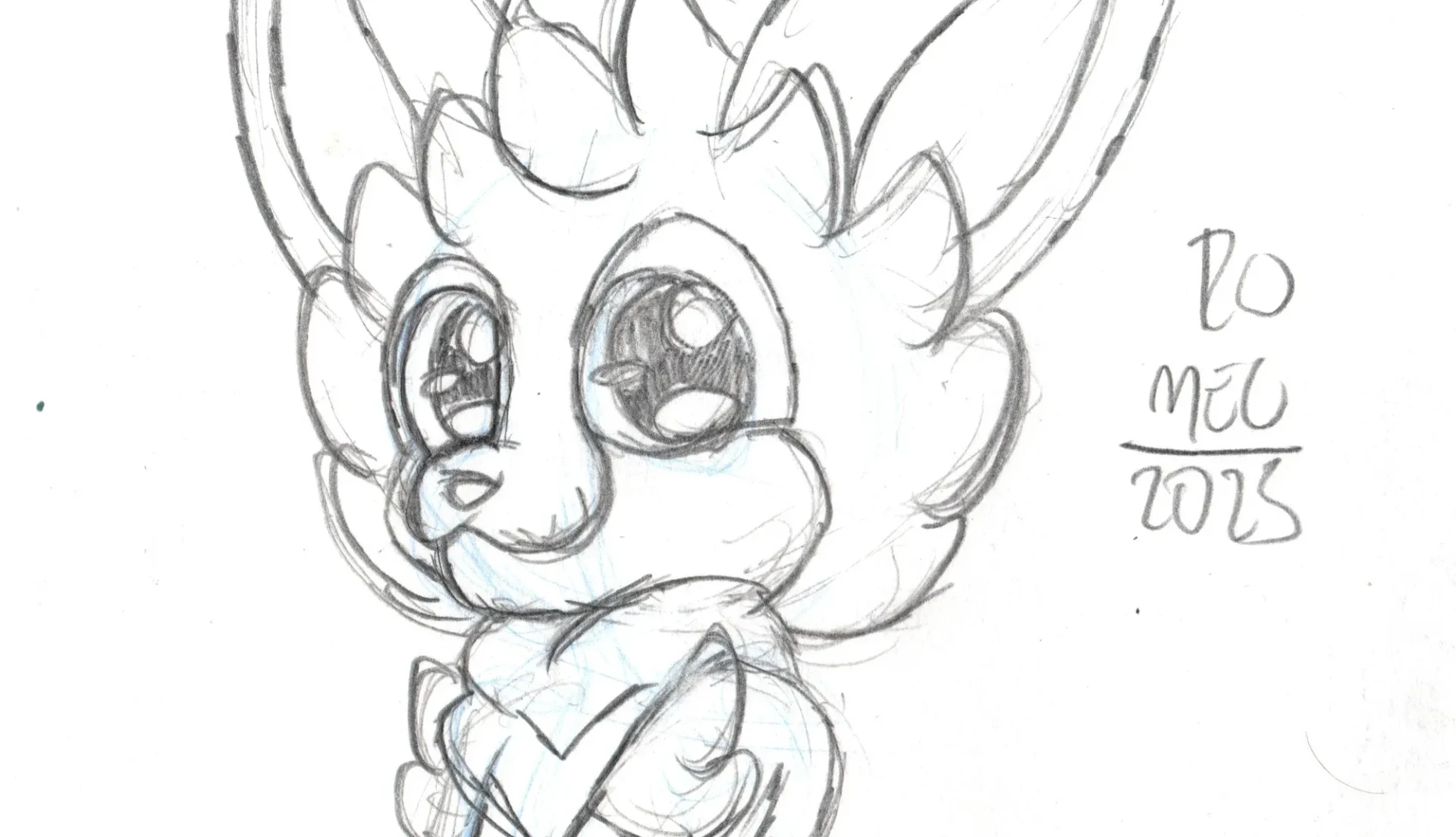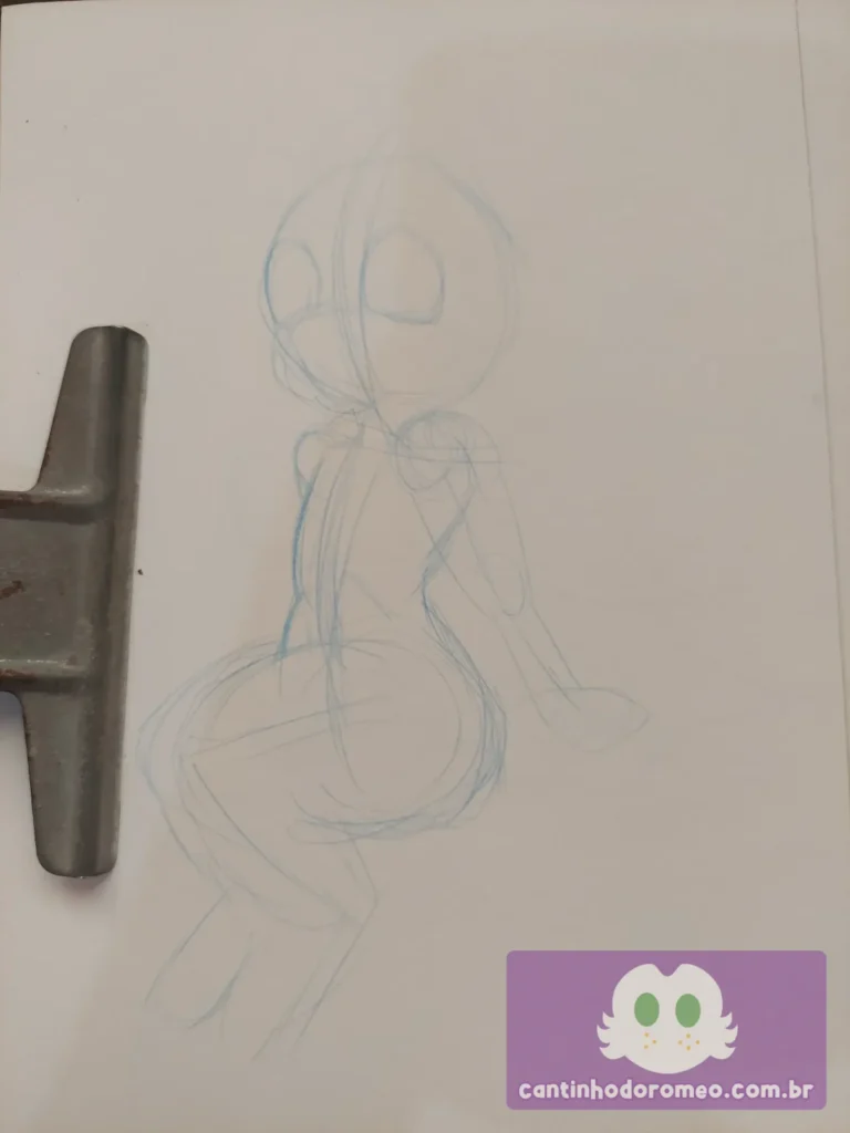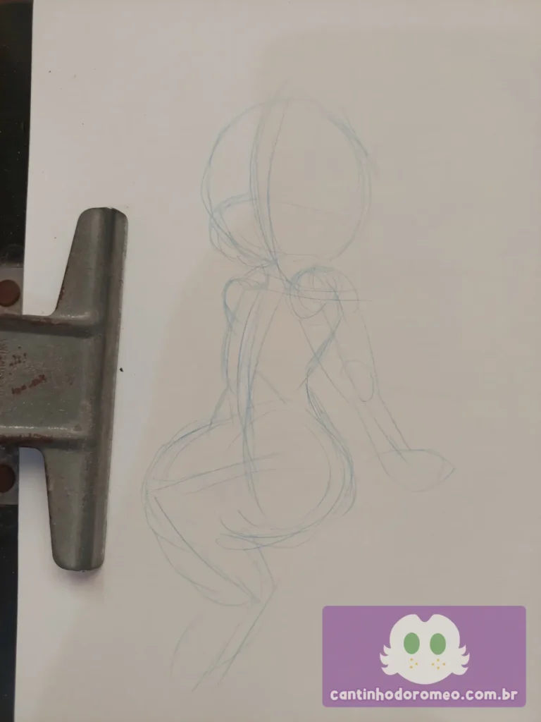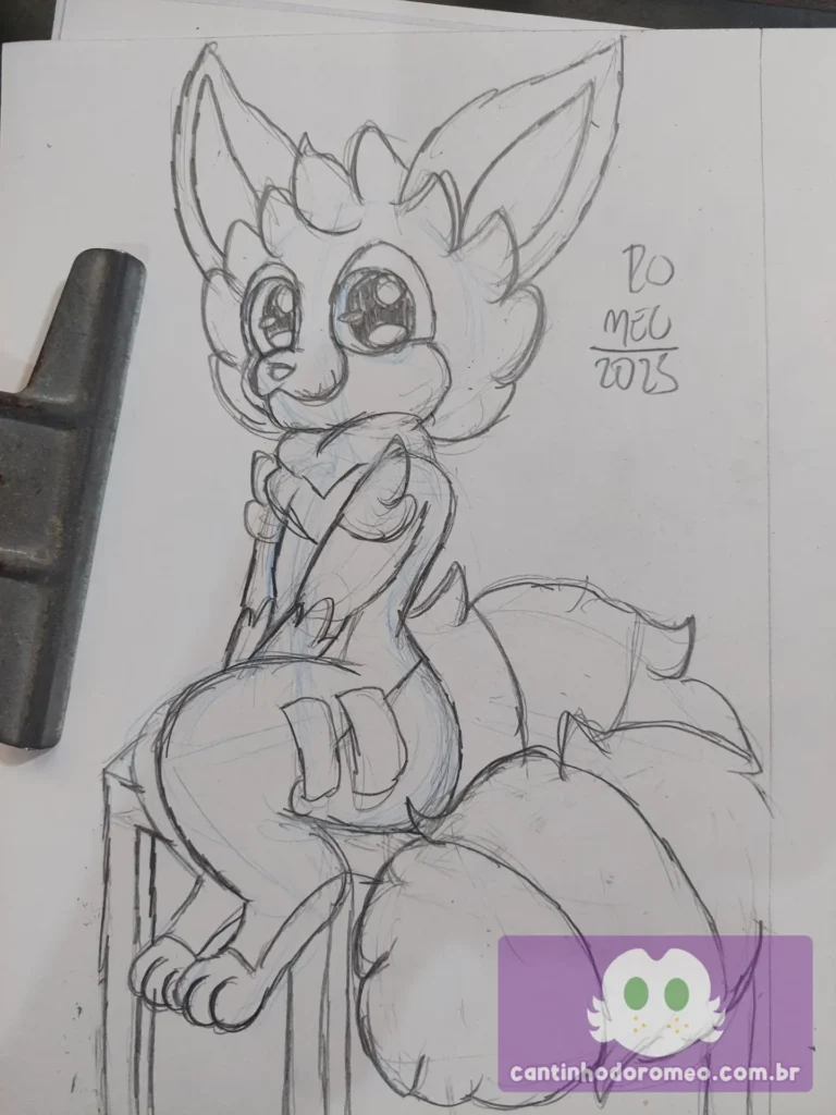Comecei o desenho como sempre: Com as primeiras linhas da pose, e depois fui para o esboço, onde fiz o corpo. Decidi fazer o personagem sentado em algum lugar. Com isso, eu fiz as coxas, tronco, braços e patas e depois eu fiz os olhos.