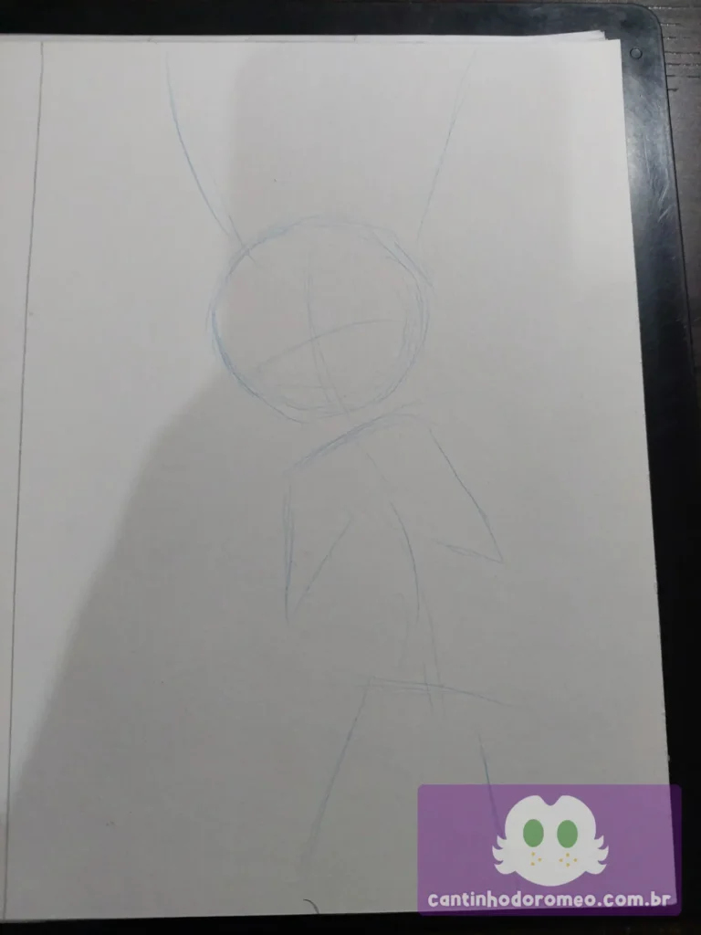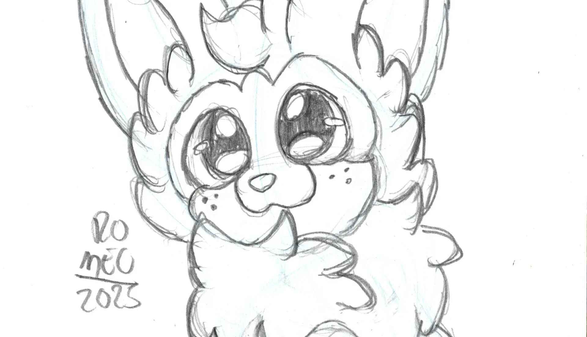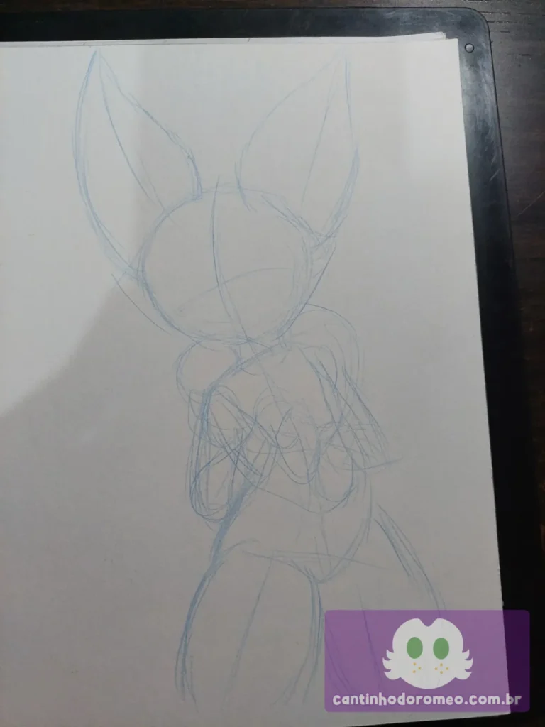 Como sempre, comecei o desenho com as primeiras linhas da pose. Eu optei por uma pose mais fofinha e que, pra mim, combinaria bastante com o Cinna. Assim, eu fui para o esboço, onde fiz as orelhas, colar de pelos, coxas, quadris, braços e patas.