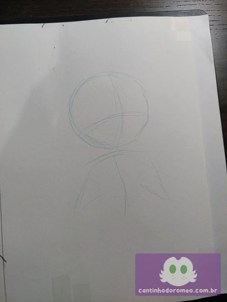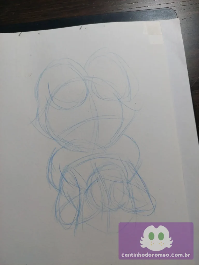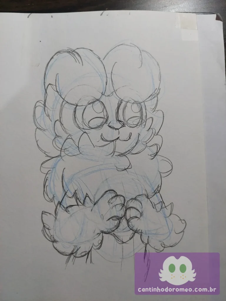 Comecei o desenho como sempre começo: Com as primeiras linhss da pose do Romeo. Depois, fui para o esboço, onde fiz as orelhas caídas, as bochechas, o tronco, braços, patas e o colar de pelos do Romeo.