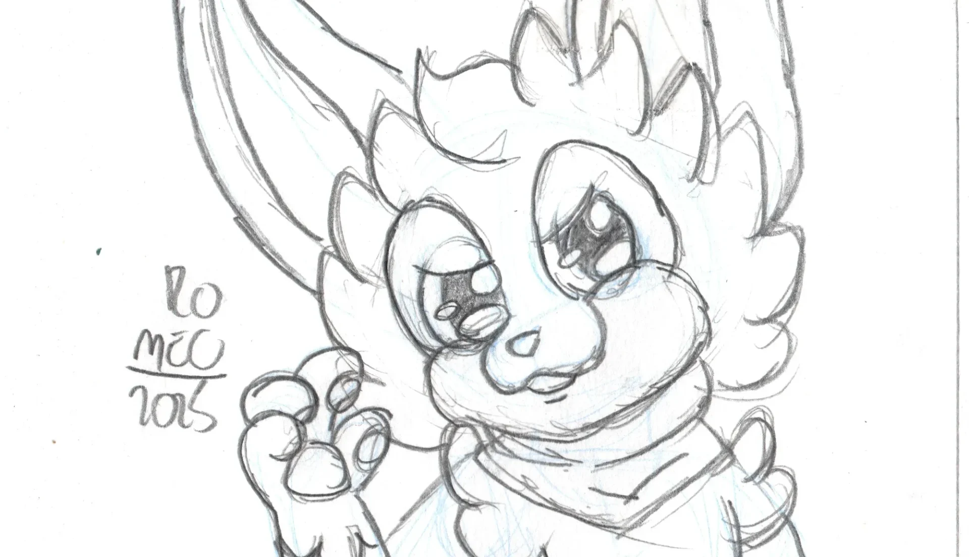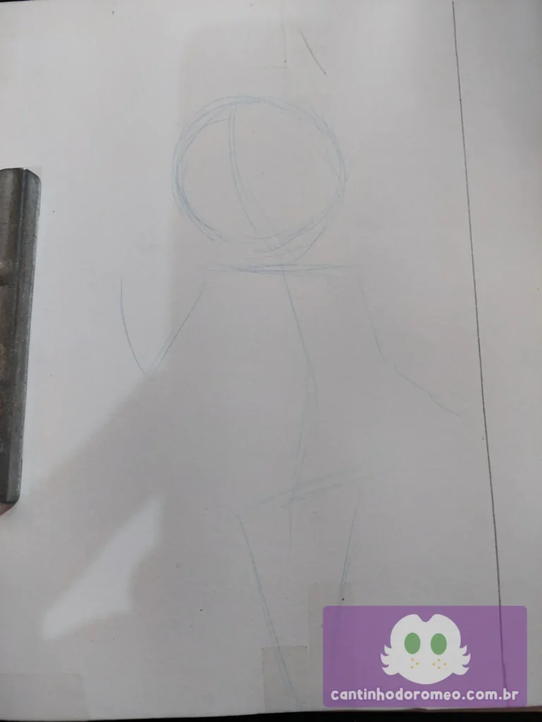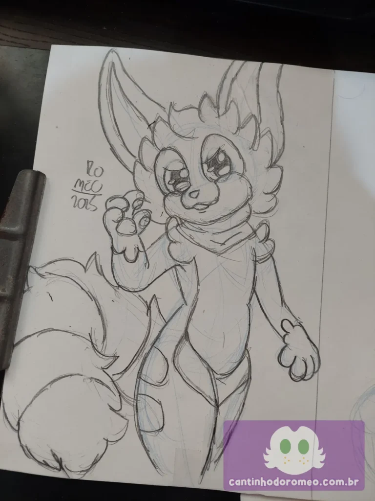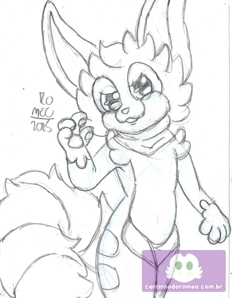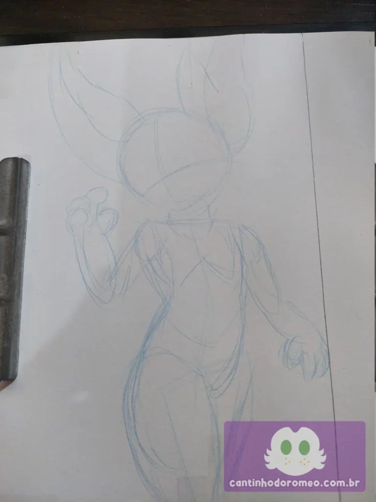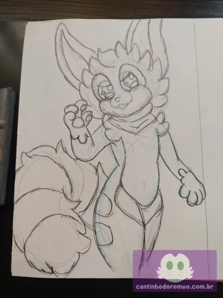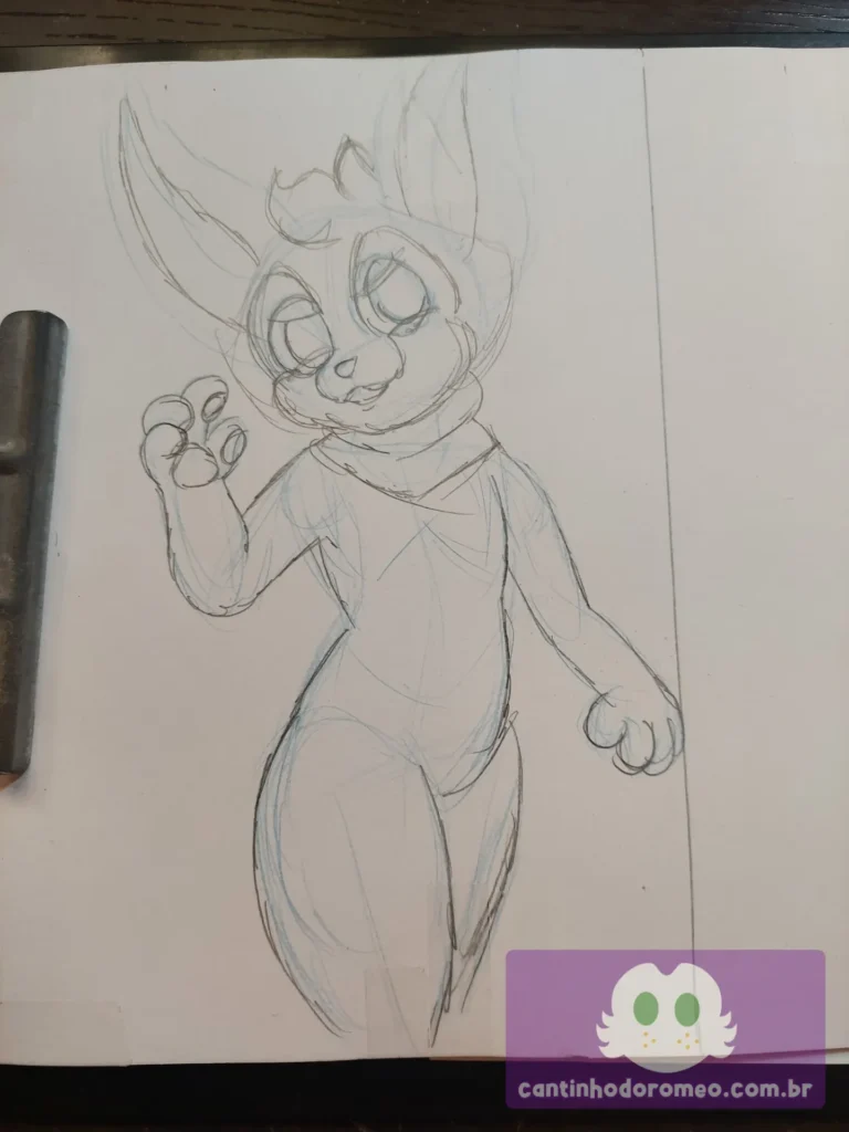 Comecei o desenho como sempre: Com as primeiras linhas da pose do desenho. E aqui, o desenho já divergiu da inspiração: Ao invés de fazer o personagem sentado, decidi fazer ele em pé. Avancei mais no esboço, onde fiz as coxas, orelhas, braços, barriga e quadris.