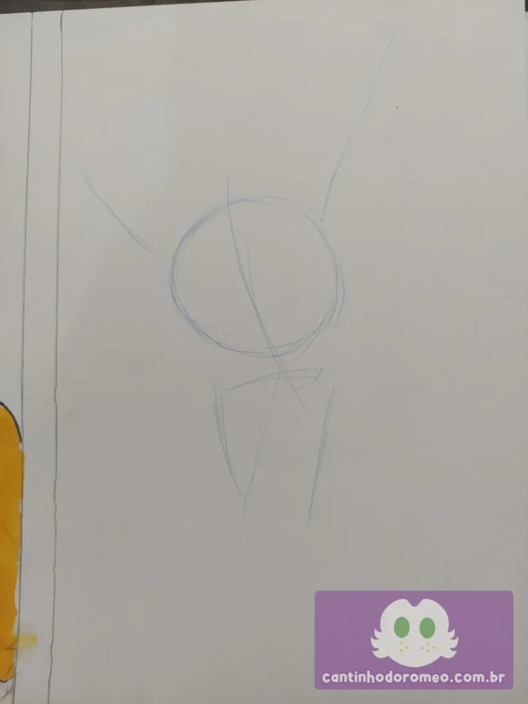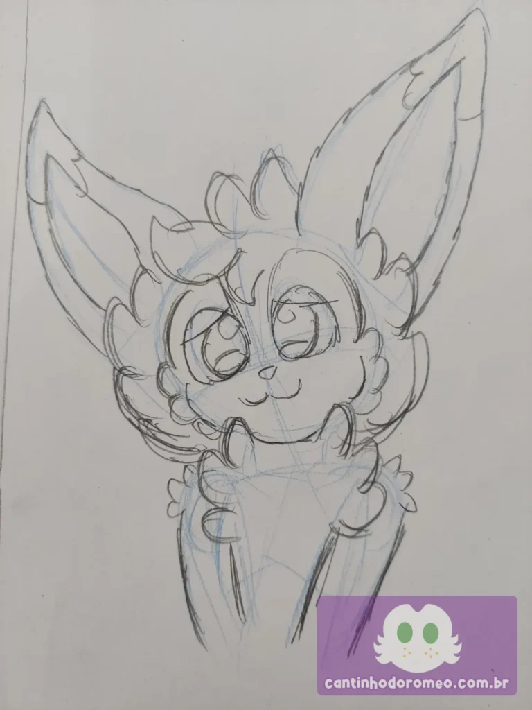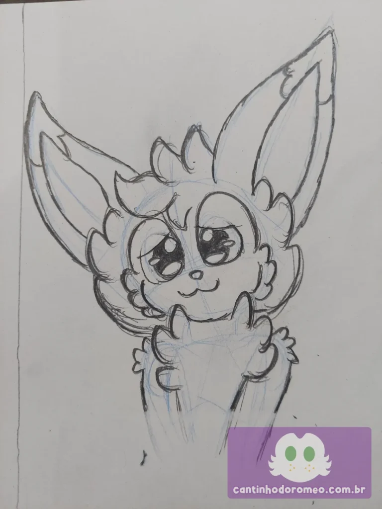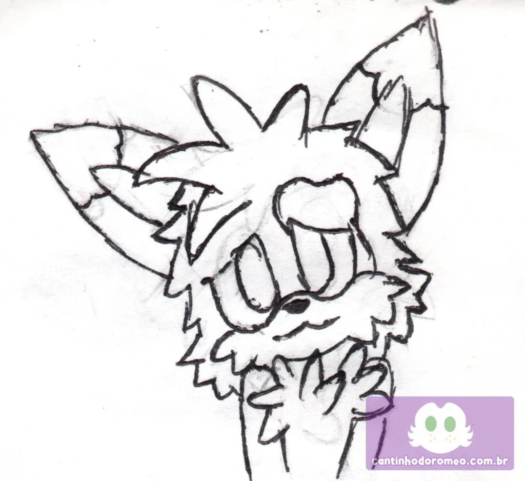 Comecei o desenho como sempre: com as primeiras linhas do desenho e depois fui para o esboço e avancei bastante no desenho. Nesse ponto, fiz os pelos da cabeça, peito e ombros, os olhos, focinho, braços, orelhas e a franja. Eu já estava gostando bastante de como estava esse desenho.