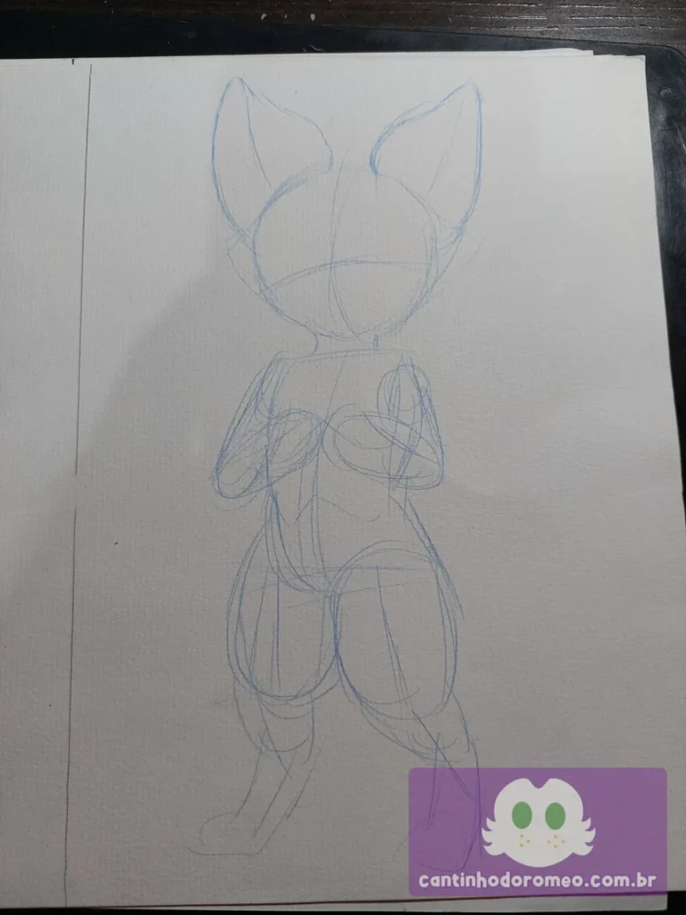 Como sempre, comecei o desenho com as primeiras linhas da pose. E depois fui para o esboço, fazendo os braços, coxas, patas, orelhas e o corpo do Wonny, e simplesmente adorei o corpo do Wonny. Acho que consegui fazer um corpo esbelto ficar bom no meu estilo.